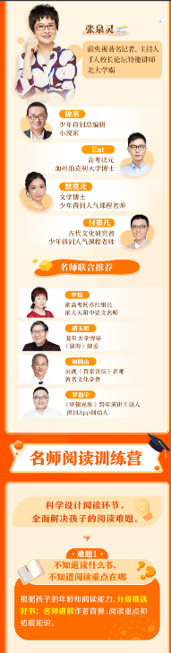张泉灵领衔4大名师每,天带孩阅子读名著,半年读完12本书,收获12种可复用的阅读能力。专属阅读家教全程辅导,帮助孩子养成阅读习惯。把阅读能力变成孩子的终身竞争力。