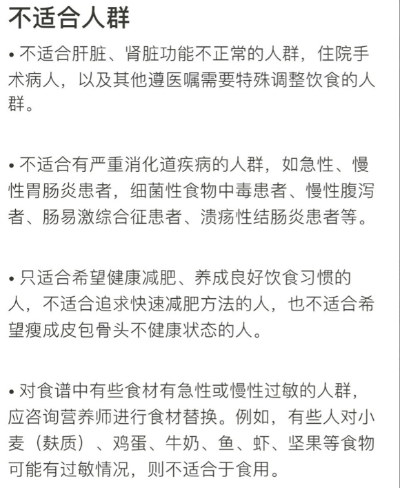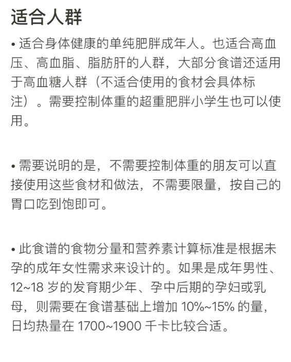·适合身体健康的单纯肥胖成年人。也适合高血压、高血脂、脂肪肝的人群,大部分食谱还适用于高血糖人群(不适合使用的食材会具体标注)。需要控制体重的超重肥胖小学生也可以使用。