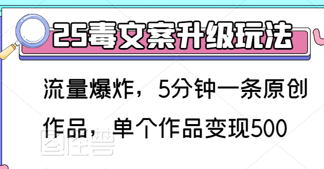 大家好,今天给大家带来的项目是《毒文案升级玩法,流量爆炸,5分钟一条原创作品,单个作品变现500》,一部手机即可操作该项目,项目实操流量单个作品最高破788w播放,引流到私域的粉丝还都不算,单靠取图小程序变现近15000+,项目算是一个长期项目,只是玩法一直在升级,给大家更新了最新的玩法,项目是完整的,没有二次收费,请放心观看学习