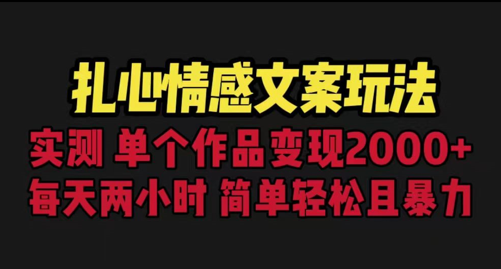 今天给大家带来的项目是《扎心情感文案玩法,单个作品变现5000+,一分钟一条原创作品,流量爆炸》,一部手机即可操作该项目,项目实操流量单个作品最高破188w播放,变现2000+,引流到私域的粉丝还都不算,项目算是一个长期项目,只是玩法一直在升级,给大家更新了最新的玩法,项目是完整的,没有二次收费,请放心观看学习。