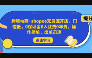跨境电商·shopee无货源开店,门槛低,0保证金0入驻费0年费,操作简单,出单迅速。shopee虽然为跨境电商平台,但是上手并不比淘宝无货源难,甚至更简单一些,而且出单更快,更加持久稳定。不同的是shopee会有更多的细节操作,需要一定的电商知识,对执行力要求更高一些,有电商经验可以做shopee,小白可以无货源开始。门槛低,0保证金0入驻费0年费,入驻前三个月免佣金,三个月之后收取交易额8%的佣金。操作简单,出单迅速。