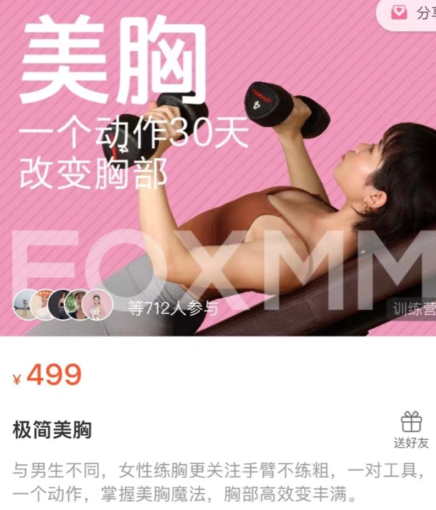 小狐极简美胸是一种通过一种动作进行胸部锻炼的计划,旨在在30天内改善胸部线条和增加胸部的紧致度。这个计划通常包括一种特定的运动动作,每天进行一定次数的练习。通过持续训练,可以加强胸部肌肉,提高胸部的紧致度和形态。