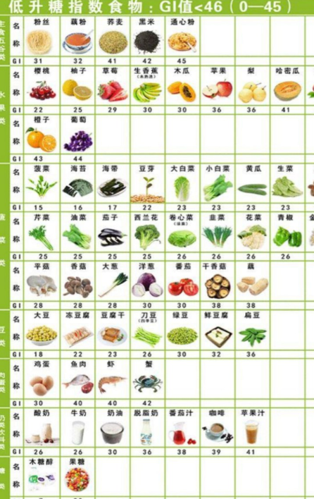 低GI食物:燕麦、大麦、全麦面包、红薯、糙米、苹果、葡萄柚、樱桃、绿叶蔬菜(如菠菜、羽衣甘蓝)、豆类(如黑豆、鹰嘴豆)、坚果(如杏仁、核桃)等。