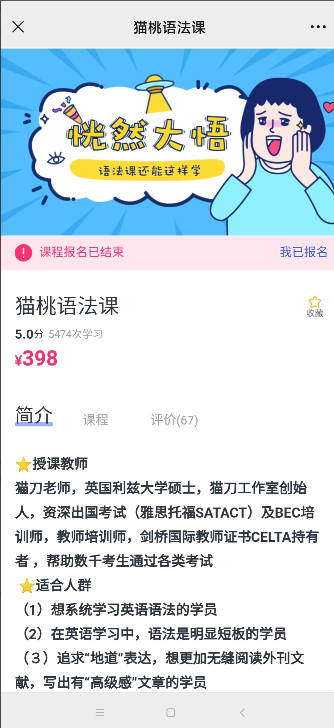 适合想系统学习英语语法的学员,在英语学习中,语法是明显短板的学员 追求“地道”表达,想更加无缝阅读外刊文献,写出有“高级感”文章的学员!