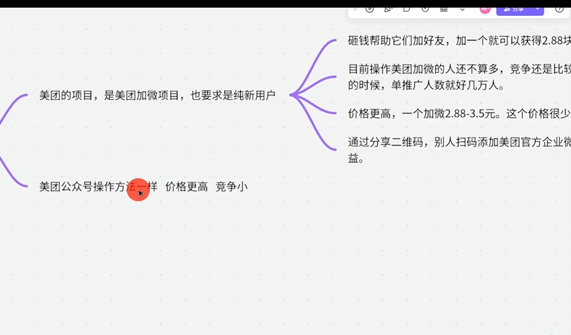 美团的项目,是美团加微项目,也要求是纯新用户,美团公众号操作方法一样 价格更高 竞争小 ,目前操作美团加微的人还不算多,竞争还是比较小的,不像之前推夸克网盘项目的时候,单推广人数就好几万人。价格更高,一个加微2.88-3.5元。这个价格很少见了,所以必须抓住这个红利期。