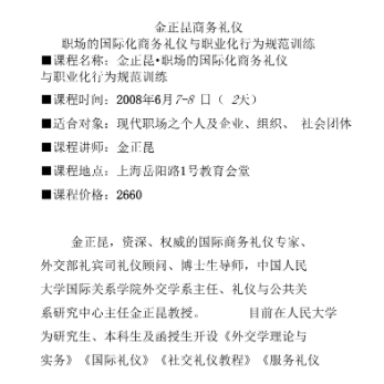 金正昆资深、权威的国际商务礼仪专家、外交部礼宾司礼仪顾问、博士生导师、中国人民大学国际关系学院外交学系主任、礼仪与公共关系研究中心主任教授。金正昆老师是近年活跃在人际沟通与社交礼仪讲台上的风云人物,不但受到人大学子拥戴,更经常为大型企业及政府部门进行礼仪及人际沟通技能的培训。