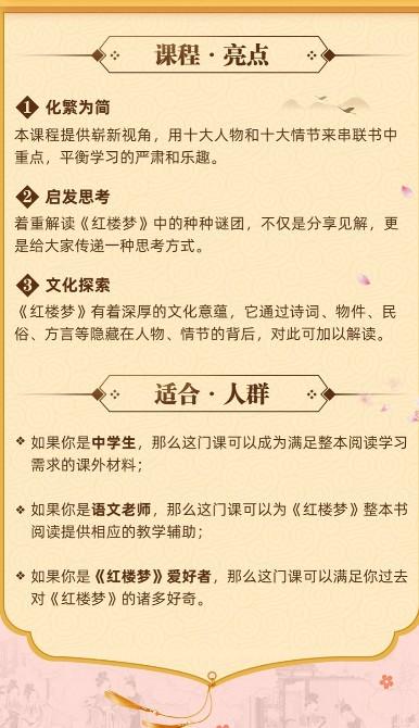 本课程提供崭新视角,用十大人物和十大情节来串联书中重点,平衡学习的严肃和乐趣。启发思考