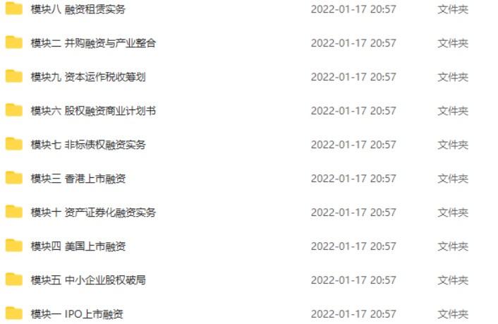 课程分为10个板块分别是:IPO上市融资、并购融资与产业整合、香港上市融资、美国上市融资、中小企业股权破局、股权融资商业计划书、非标债权融资实务、融资租赁实务、资本运作税收筹划、资产证券化融资实务。