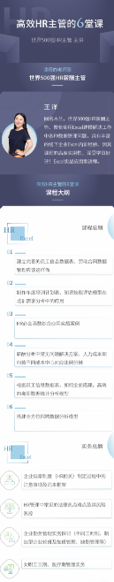 500强外资制造业模块经理10+的工作经验、结合6+的Office培训经验,重磅打造给HR主管的6堂直播课。课程从真实应用场景出发,结合实务管理,给出了完善、拿来即用的员工信息管理、年度培训需求分析、高效的离职数据分析、招聘数据分析模型。
