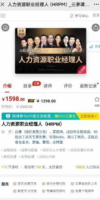 《人力资源职业经理人(HRP M)》价值:1598元,导师:白睿(组织发展总监)、夏国玮、战狼先生陈昌锦、90后员工关系专家陈豪、廖雁、曹锋、吴西楚、徐渤bobo、海儿丁晓文等。人力资源职业经理人认证班,从精通到资深,实现60天迅速从HR主管进阶HRD的华丽转身