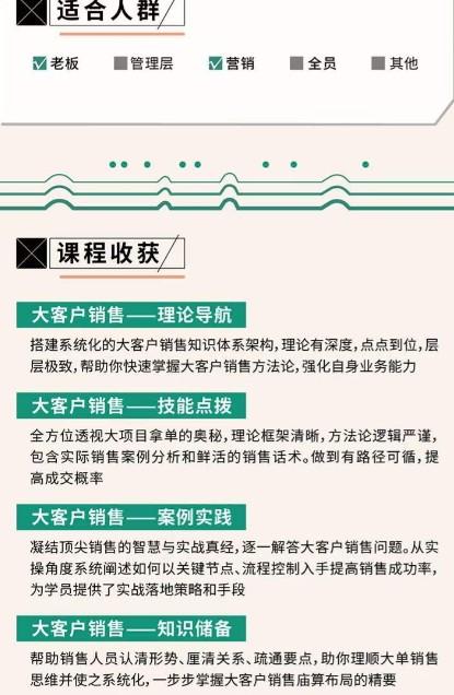 大客户销售业绩提升学这套 本内容基于理论框架模型,通过经典的实战案例,解读详的大单销售过程,摒弃“只教套路,不教思路”的陷阱,普及大单销售常识,训练大客户销售思维,梳理大单销售成功运作的要点、流程,通过深入剖析大单销售的成功运作