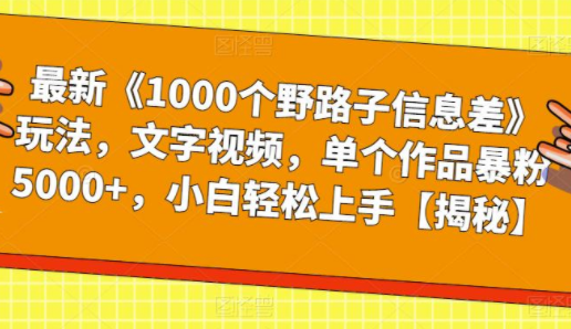 最新《1000个野路子信息差》玩法,文字视频,单个作品暴粉5000+,小白轻松上手【揭秘】,咱们通过文字视频的展现方式处理,不需要处理文案,不需要配音,也不需要自己作图。只需要看一遍视频教程。即可轻松操作!而且形式新颖,很容易就能爆掉。100%过原创!实测,一个作品暴粉5000+。