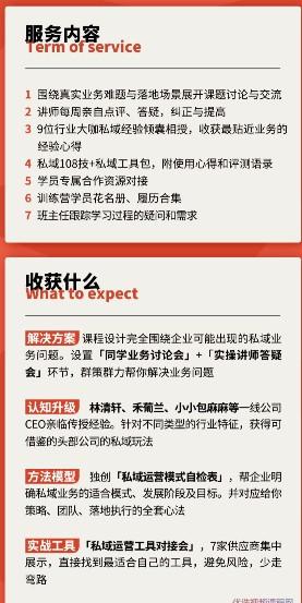 我们将以1个月为时间周期,在线上训练营中以企业实际面临的业务问题为背景,针对品牌方和企业主的私域负责人/操盘手集中性培训,帮助他们实现在思维和执行落地到“上接战略,下达绩效”的效果。