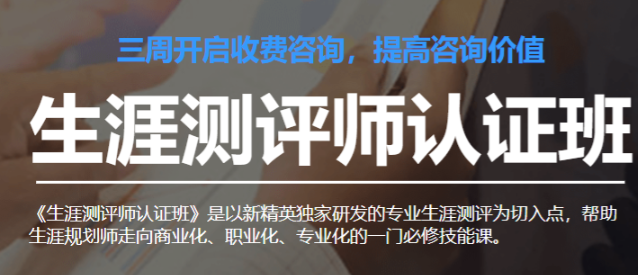 《生涯测评师认证班》是以新精英独家研发的专业生涯测评为切入点,帮助生涯规划师走向商业化、职业化、专业化的一门必修技能课。通过课程系统的学习生涯规划的理论知识,工具模型,使用方法及考试,找到遇到职业困惑的原因,并通过课上学习的方法来解决这些问题,获得权威行业证书,有效的完成“自助助人”的学习和成长过程。