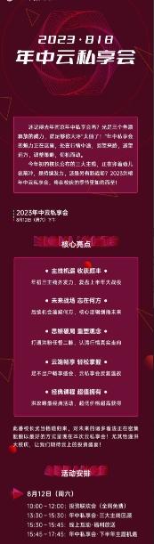 还记得去年南京年中私享会吗? 光是三个鱼漂释放的威力,就足够你大呼"太值了!"年中私享会的魅力正在这里,处在行情中途,回望来路,遥望远方,调整策略,伺机而动。今年初的校长公布的三大主线,正在卯着劲儿往前冲,是持续发力,还是另有新战场? 2023洪榕年中云私享会,将在校庆的季节里如约而至