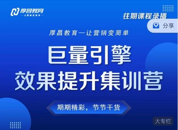 巨量引擎效果提升集训营厚昌是一个专门针对巨量引擎广告平台的培训项目。巨量引擎是一家移动广告平台,广告主可以通过该平台进行广告投放,以吸引更多的用户关注和点击。