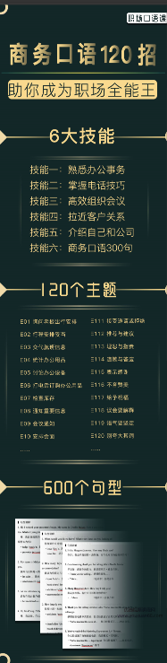 商务口语课共6大技能,120节,每节一个主题,600个常用高频句型。为你精心归纳,减少你的摸索总结时间,拿来就能用,助你成为职场全能王。