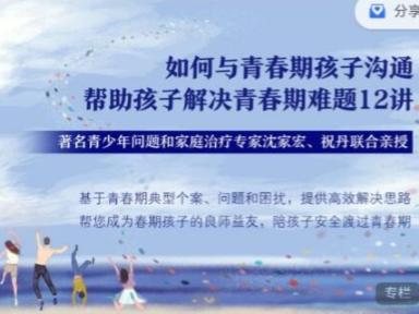 青少年问题、家庭治疗专家沈家宏和祝丹联合亲授,通过12次精品课程,呈现孩子在青春期面临的典型问题和冲突,并从青少年心理学和家庭治疗双重视角,提供高效的干预建议和解决办法,帮孩子顺利渡过青春期。