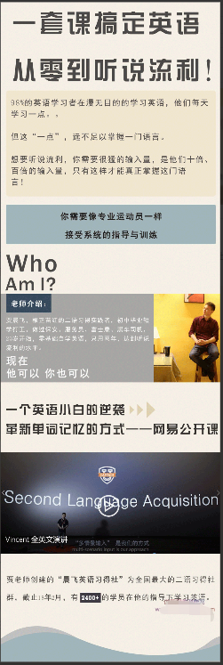 贾晨飞,初中毕业,23岁开始零基础自学英语。通过研究乔姆斯基和克拉申博士的语言学论文。加上实践,摸索出一套科学的语言习得方式。从零基础到听说流利,只用了两年时间。现在致力于普及传播用二语习得学习英语。