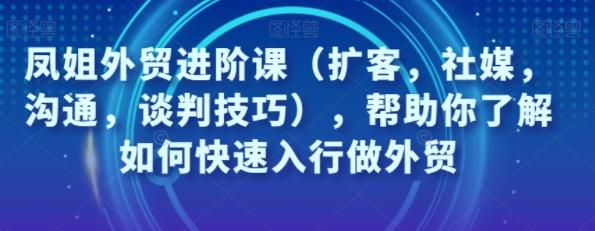 课程来自凤姐的外贸进阶课(扩客,社媒,沟通,谈判技巧)。帮助你了解如何快速入行做外贸,工厂老板可以扩展公司外贸部门,外贸管理层掌握培训新人的秘诀,节省时间,外贸业务学习外贸客户沟通谈判新技巧。