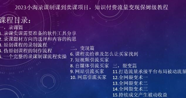 我这套课程就是教大家怎么制作课程出售赚钱,分为3大章节15节课时,具体目录如下。