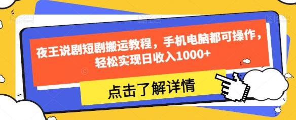 夜王在知乎上分享了剧短剧搬运教程,这是一种可以通过手机或电脑操作的方式,轻松实现每天1000+的收入。剧短剧搬运是指将电视剧、电影或其他视频资源转载到自己的平台上,并通过广告或其他方式实现盈利。