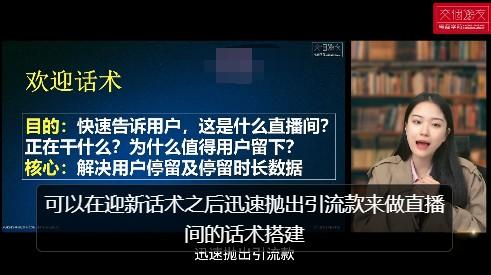 欢迎话术的核心和技巧:欢迎话术的目的是快速告诉观众直播间的主题和吸引力,以解决用户停留和时长数据的问题。要实现这个目的,需要注意情绪、价值以及心理需求三个要素。同时,可以在换音话术后迅速添加营销活动以刺激用户停留,如果有引流产品的同学,可以在迎新话术后迅速抛出引流款来做直播间的话术搭建。
