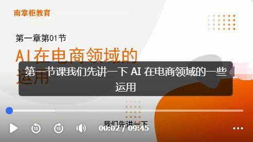 这段课程主要介绍了AI在电商领域的应用,包括文案和内容、设计和摄影、运营和推广以及其他应用。以下是对AI在电商领域应用的一些总结:
