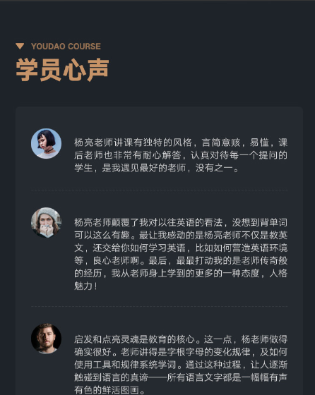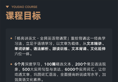 杨亮讲英文·全民英语背诵营」重拾背诵这一经典学习法,立足于语境学习,以文章为载体,从文本精讲、单词讲解、语法解析、跟读训练、文本背诵、文化延伸六位一体。