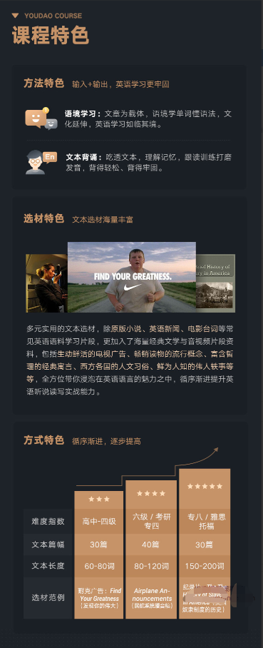 6个月深度学习,100篇精选文本,200个常见语法现象,500大实用句型与表达,6000个实用词汇,让你吃透文章,巩固词汇语法,全面提高听说读写水平,加强英语文化素养。