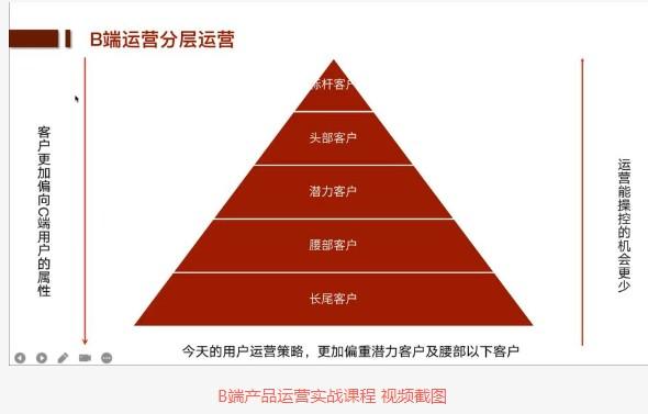 这段课程似乎是某次课程的讲解内容,主要讲述了B端运营中用户搭建运营和增长体系的一些策略和方法。其中涉及了用户分层的概念,不同类型用户的特性和运营策略,以及发现问题的过程和解决方案的寻找。