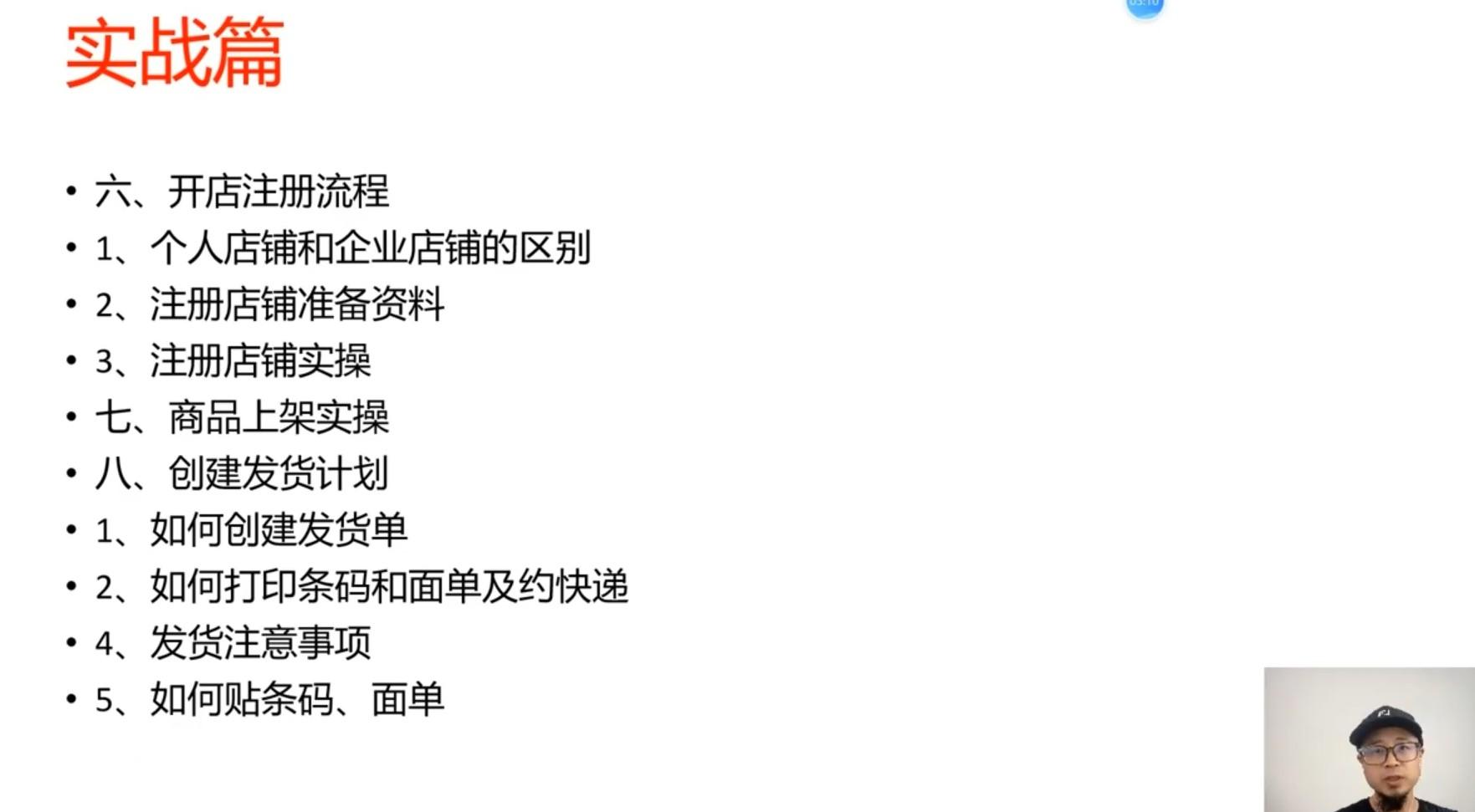- 实操:我们将用9个课时演示如何开店注册,个人店铺和企业店铺的区别,商品如何上架,以及如何发货,包括货物如何发过去,如何打包贴标等。