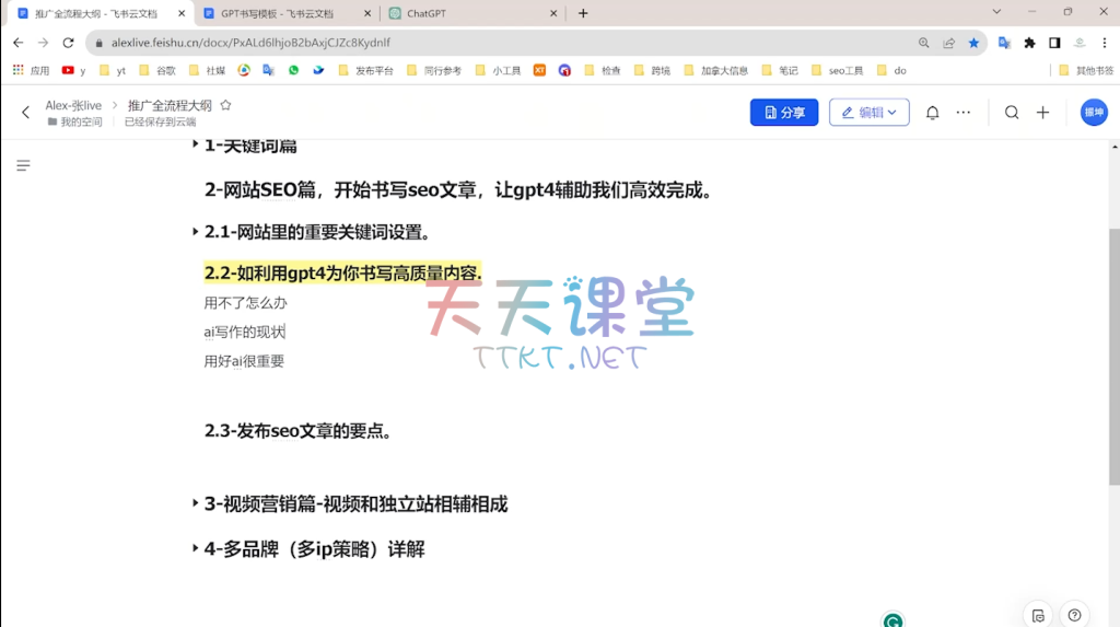 阿力克斯2024最新版外贸推广课程,结合GPT4辅助SEO,全面解析外贸营销精髓。课程涵盖SEO、社媒视频营销等,从关键词挖掘到内容创作,再到谷歌与社媒运营,实战演示推广全流程,助力企业提升海外知名度,拓展国际市场。