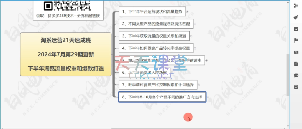 《白凤电商·第29期淘系运营21天速成班》2024年7月更新版,聚焦下半年淘系平台运营现状与流量趋势,涵盖不同类型产品的流量规划及玩法匹配,详解流量权重关系与渠道选择,教授提升产品转化率技巧,并指导新品筹备与旺季前蓄水策略,深入分析目标消费群体,确保付费推广高效实施,针对8-10月定制化推广方案,助力打造爆款。