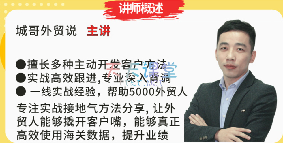 《城哥外贸说·海关数据开发客户实战课》是专为希望利用海关数据高效精准开发客户的外贸专业人士量身定制的课程。本课程深入剖析海关数据的应用价值,指导学员如何选择适合自己的数据资源,并避免常见的使用误区。通过实操教学,您将学习到从数据准备、客户开发到深入背景调查的一系列技能,包括基础与进阶技巧,确保找到的每一个潜在客户都能得到最有效的跟进。课程还提供了真实的客户开发案例分析,帮助理解不同市场和区域的数据特点及挑战。