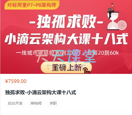 独孤求败《小滴云架构大课十八式》,官方售价7599元,针对互联网大厂架构师级别,覆盖底层原理到实战应用,包括技术选型、业务架构、性能优化等,旨在培养高可用、高性能、高并发的架构设计能力,构建完整的知识体系。课程容量18.64GB,含视频及资料。