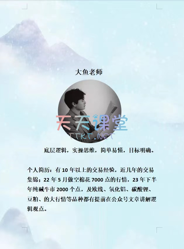 《大鱼·期限回归交易课程》旨在培养期货交易者的专业思维与技能。课程覆盖从基础概念到实战应用,包括期货思维构建、技术面解析、基差与升贴水理解、持仓与趋势分析、仓单及供需状况评估、月差交易策略、以及期转现操作技巧等核心内容。通过理论结合案例,学员将掌握确定性行情识别、开仓时机选择、资金管理与风险控制,最终实现交易决策的科学化与系统化。