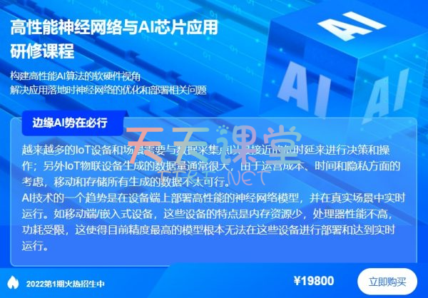本课程为期七周,专注于高性能神经网络与AI芯片的应用。第一周涵盖轻量化网络结构设计及其实例分割性能评估。第二周学习如何运用知识蒸馏技术压缩检测网络,并探讨低秩分解优化方法。第三周聚焦于结构化剪枝技术以减少模型复杂度。第四周深入研究网络量化技术,特别是uint8量化实践。第五周讨论行业就业趋势和推荐相关职位,并介绍OpenPPLL架构及神经网络编译器。最后两周通过NCNN框架讲解离线量化过程及在eaidk310板上的部署演示。