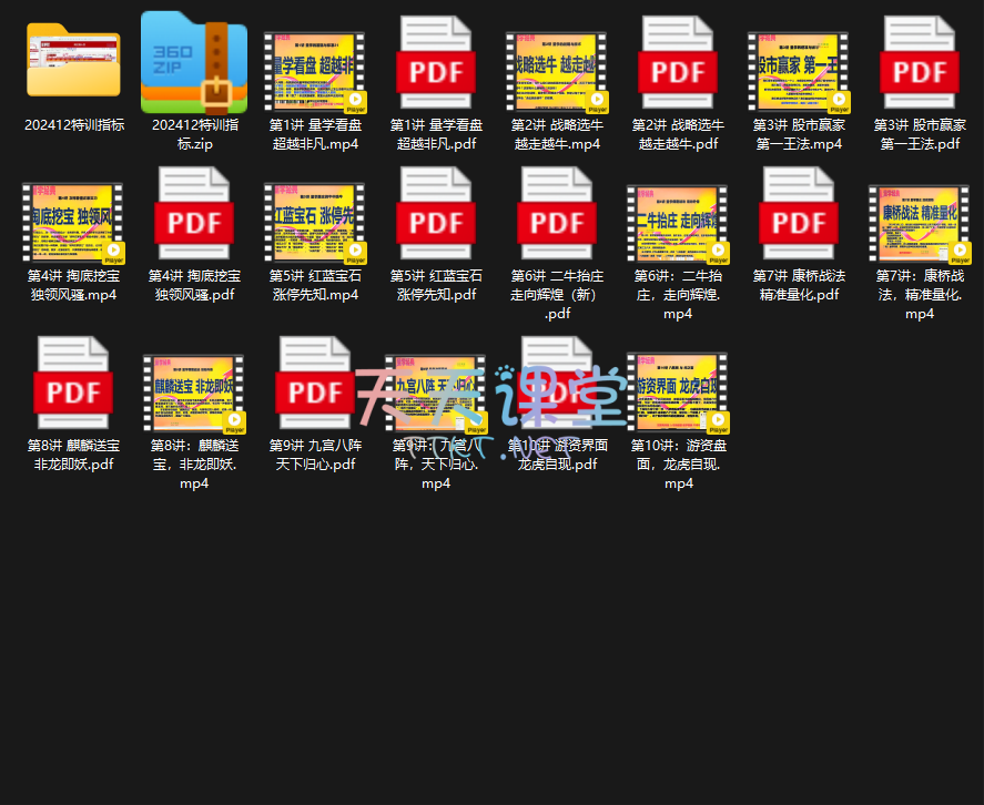 黑马王子北京特训班线下课,包含合成视频与配套文档、指标。课程从量学看盘讲起,带你洞察市场先机。通过战略选牛、股市赢家王法等内容,助你掌握选股策略。掏底挖宝、红蓝宝石等技巧,助你精准把握涨停时机。还有康桥战法等多种战法,精准量化投资,带你在股海纵横驰骋。