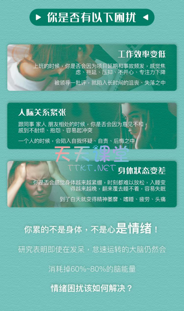 本课程专为忙碌的成年人设计,21种实用技巧,有效管理日常情绪波动,提升生活品质。从基础的“着陆练习”与“正念呼吸法”,到进阶的“化焦虑为动力”与“办公室瑜伽”,每一节课都将引领你深入探索情绪的奥秘,学习如何正面应对压力、失眠、悲伤、自卑等常见情绪困扰。