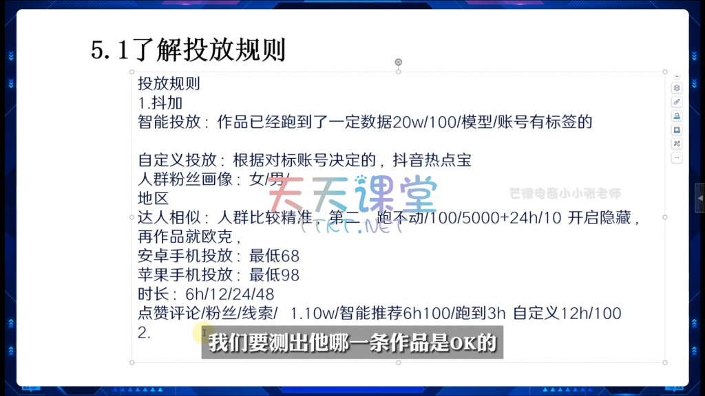 芒禄电商·抖店正规玩法3.0-抖音小店电商教程》由小小张老师主讲,涵盖抖音小店从零开始到精通的全过程。课程包括店铺搭建、选品策略、商品优化、发货售后管理、千川广告投放等核心内容,并详解违规商品发布注意事项。此外,还教授如何利用图文和直播带货提升销量,通过实操演示和答疑解惑,帮助学员快速掌握抖音电商运营技巧,实现店铺稳定增长。