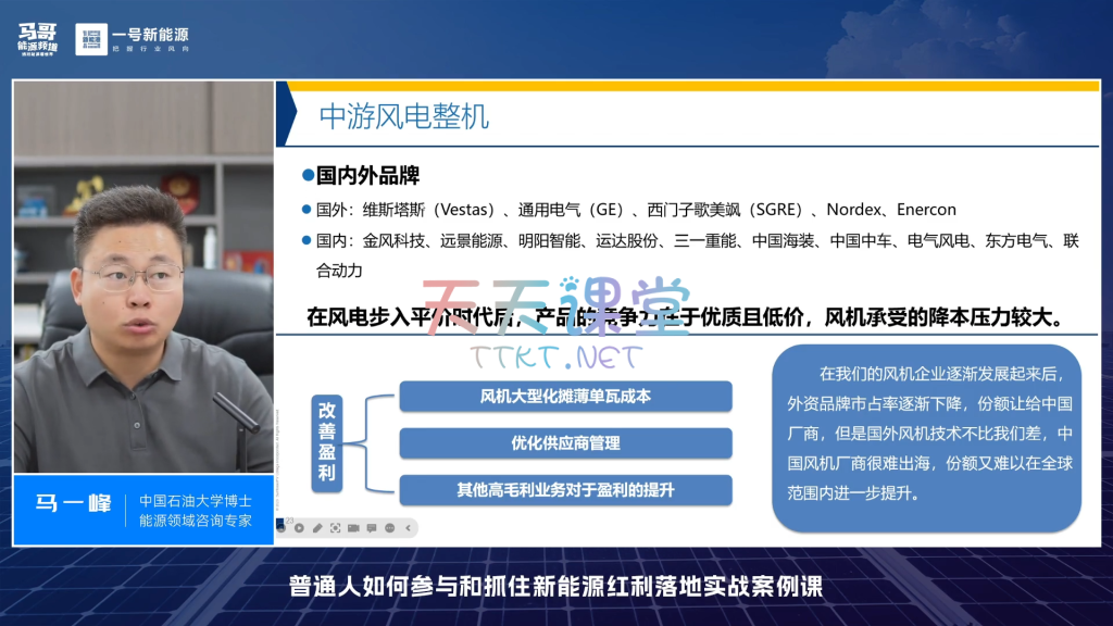 本课程《新能源红利实战课:普通人如何把握机遇》由资深新能源行业专家马一峰老师主讲,旨在帮助普通人深入理解新能源行业的发展逻辑,掌握参与新能源红利的机会,实现个人财富的增值。