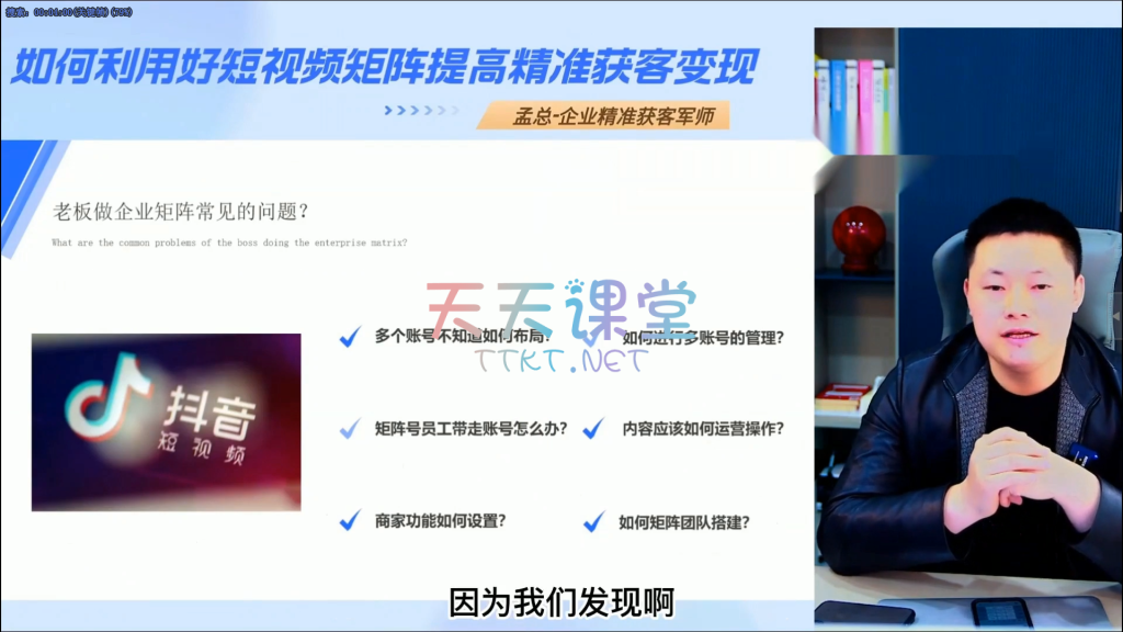 《孟总・企业短视频教程》专为老板打造,聚焦 “懂策略不实操” 核心。从中小企业做短视频的必要性、常见问题到变现渠道、平台选择全解析,拆解算法流量池规则与 IP 打造逻辑。涵盖账号限流识别、五件套设置、蹭热点技巧,详解抖加投放实战与矩阵搭建避坑指南,最后解锁抖音 SEO 搜索推广,助老板掌握短视频运营底层逻辑。