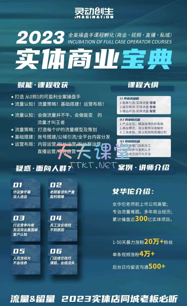 在这门课程中,女华佗将亲自为你讲解她的同城实体商业宝典,教你如何利用异业联盟、新媒体、活动策划、会员制、体验营销等方法,打造你的实体店的核心竞争力,提升你的客户忠诚度,增加你的收入和利润。