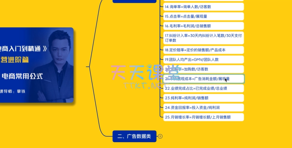 • 广告数据类:涵盖了广告占比、点击转化率、PPC、ROI、保本投产比、环比、同比等9个广告数据的计算公式和含义,让学员了解电商的推广效果和投入产出比的评估方法。