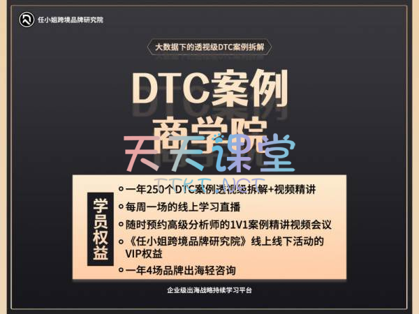 本课程由任小姐跨境品牌研究院推出,深度拆解96个跨境品牌DTC成功案例,涵盖普货差异化、品牌定位、环保主打、高客单价、私域流量、细分市场等多个策略。通过详细分析各品牌背后的运营思路和市场定位,帮助学员学习并借鉴成功经验,为跨境品牌建设提供实战指导和灵感来源,助力品牌出海,开拓国际市场。