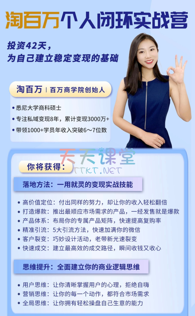 你是否渴望打造个人IP,实现稳定变现?淘百万42天个人闭环实战营,为你量身打造一套完整的商业变现方案!从价值定位到爆款打造,再到产品体系搭建与精准引流,我们助你步步为营,成功变现。