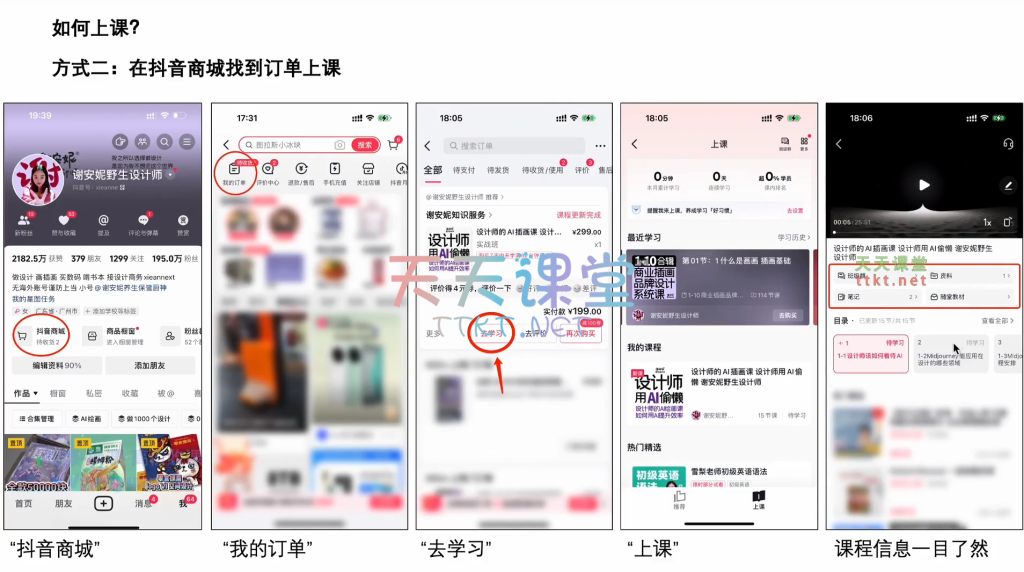 如何上课:我们将提供三种上课方式,包括在抖音课堂上课,通过抖音商城找到订单上课,以及在学浪平台上课。我们将一一展示这些方式,以帮助你更好地理解如何上课。