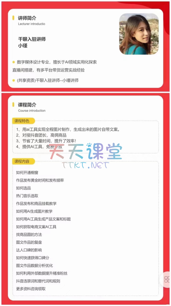 《AI短视频带货实战课》是针对创业者、上班族、宝妈、大学生等广大人群设计的短视频带货实战课程。通过AI工具实现全程图片制作,并生成自带文案的图片,对接抖音团长高佣商品,节省时间,提升效率。课程内容涵盖开通橱窗、作品发布、选品技巧、热门音乐选取、AI图片生成与文案创作等核心技能。无论你是AI零基础还是短视频新手,都能通过本课程快速上手,实现图文带货稳定出单,长期发展。课程还包括团长商品对接、素材等实用资源,助你轻松开启短视频创业之路。